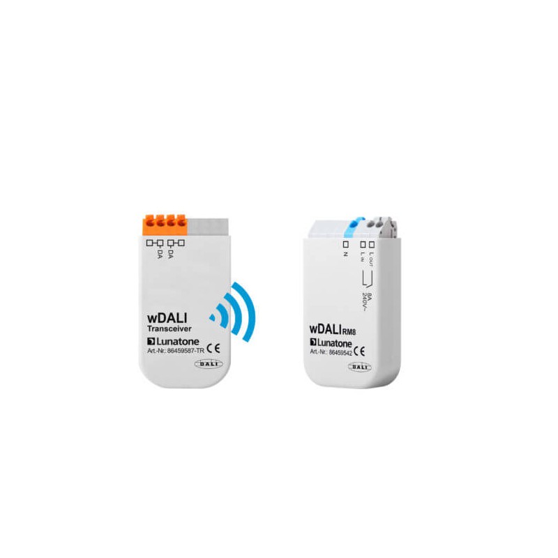 Dieses wDALI-Relaismodul dient zur drahtlosen Steuerung nicht dimmbarer Lasten. Das Set besteht aus einem Transmitter (Sender) und einem Empfänger. Der Sender ist an den DALI Bus angeschlossen, der Empfänger mit Relaisfunktion wird von der Netzspannung versorgt. Reichweite zwischen Transmitter und Empfänger: ~ 300 m (draußen) und ~ 10-20 m (drinnen).