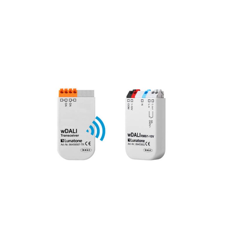 Kabelloser und über wDALI gesteuerte 1-10V Schnittstelle mit integriertem Relais zum Schalten von Verbrauchern mit 1-10V Steuereingang. Das wDALI RM8 0-10V ermöglicht die Integration von räumlich getrennten Lasten wie zum Beispiel Stehleuchten und Außenleuchten, in ein DALI System.