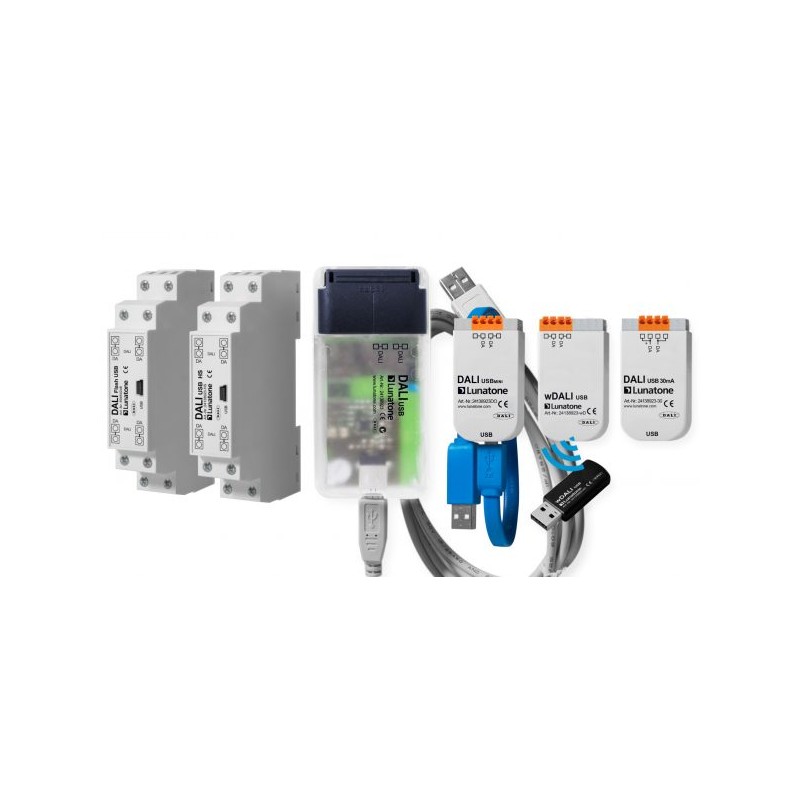 Das DALI USB dient der Kommunikation zwischen DALI Cockpit PC Software und den Geräten am DALI Bus. Es ermöglicht die Adressierung und Konfiguration von DALI Installationen. Das DALI USB ist in 6 verschiedenen Ausführungen erhältlich: mit Zugentlastung, für Hutschiene (mit oder ohne Flash-Speicher), für Unterputzdose (mit oder ohne integrierter 30mA Busversorgung), oder als drahtloses wDALI Modul.