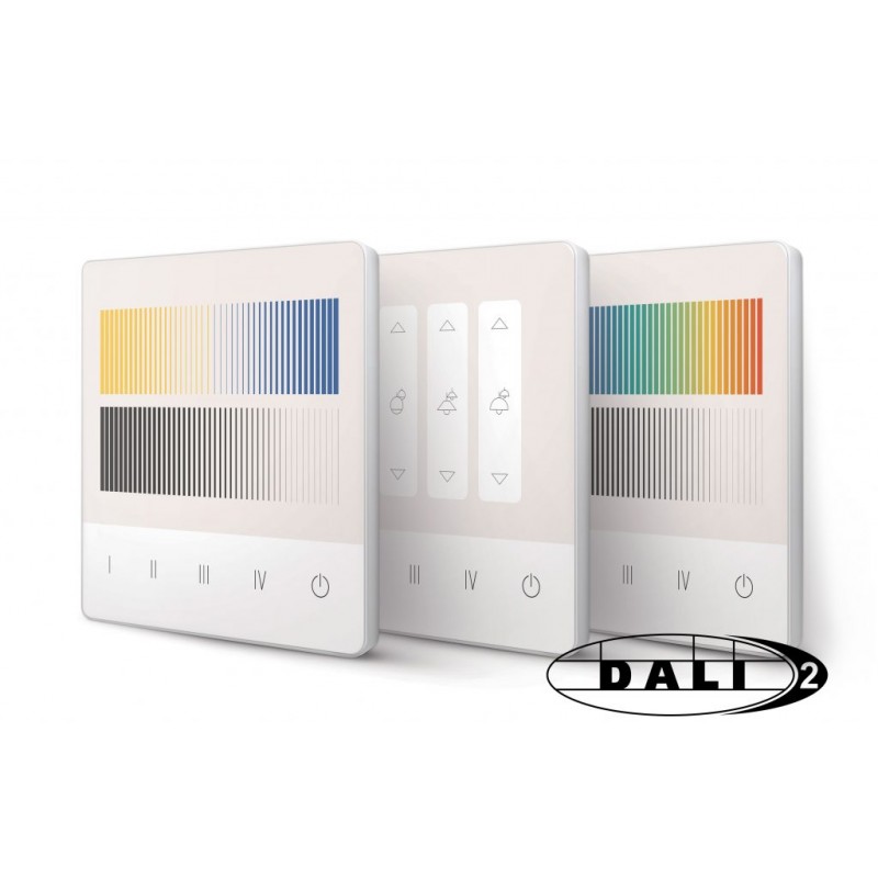 Das DALI-2 Touchpanel ist ein multifunktionales Steuergerät mit bis zu 16 frei konfigurierbaren Tasten. Die Anzahl der Tasten und die dazugehörigen DALI Befehle können in der DALI Cockpit Software eingestellt werden. Das Bedienfeld des Panels kann an verschiedenste Anwendungen angepasst werden. Eine große Anzahl von standard Bedienoberflächen sind vorhanden und kundenspezifische Designs werden auf Anfrage umgesetzt.